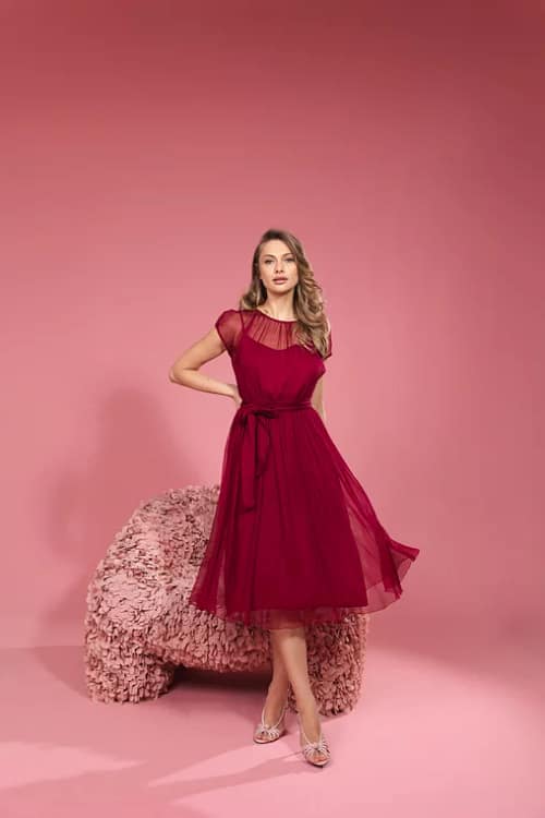 Modelul nostru are 1.78 inaltime, bust 84 cm, talie 65 cm, sold 93 cm si poarta o rochie marimea 36.