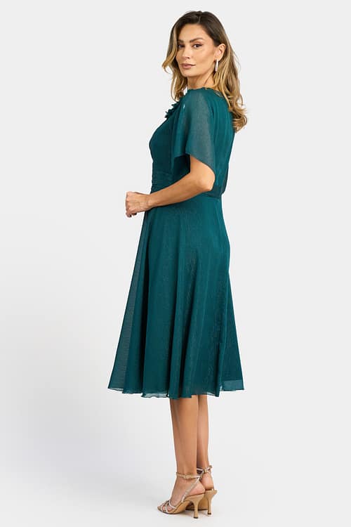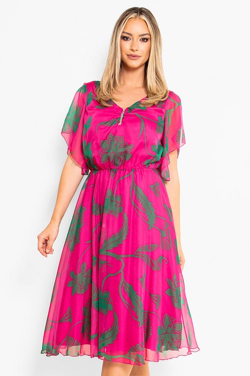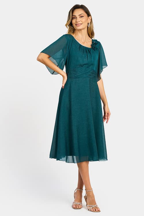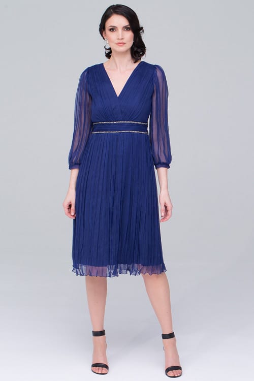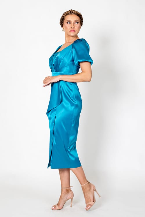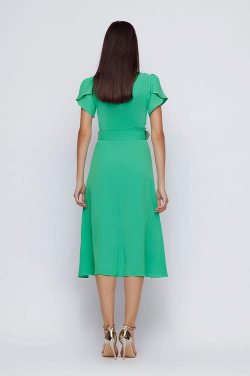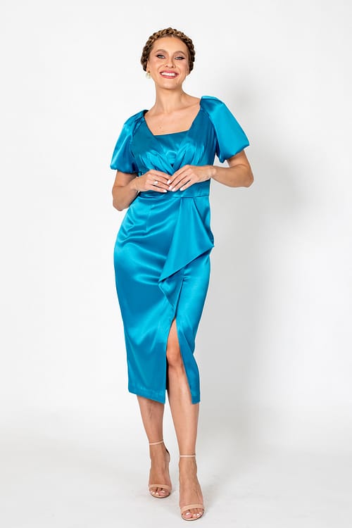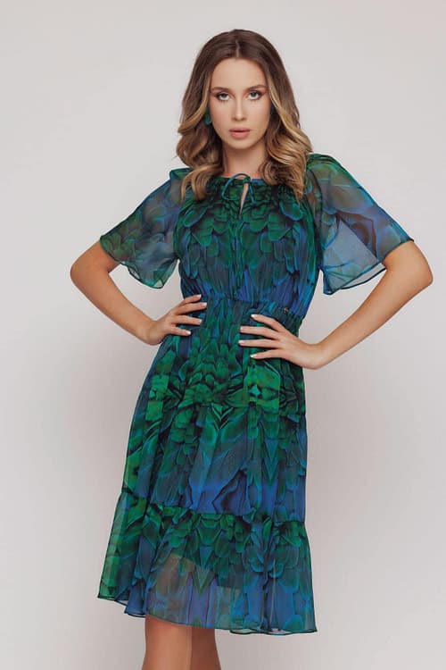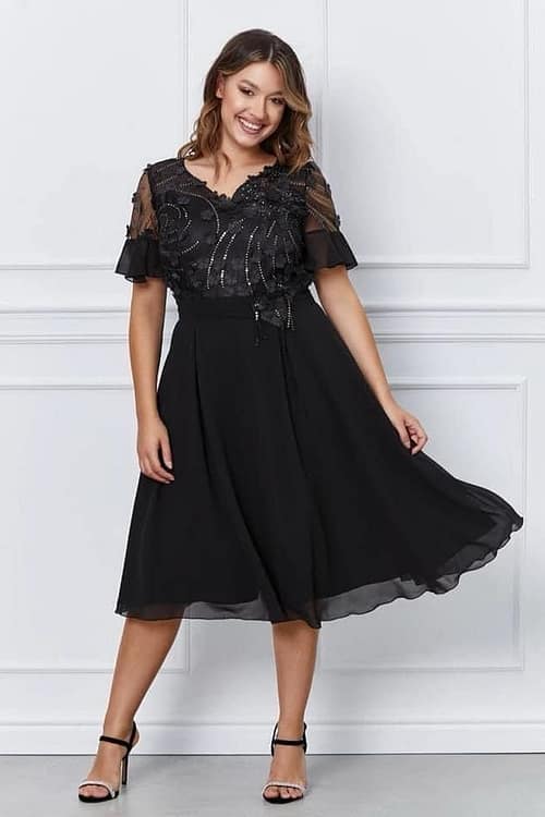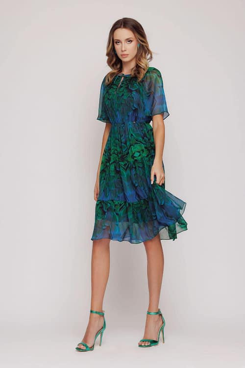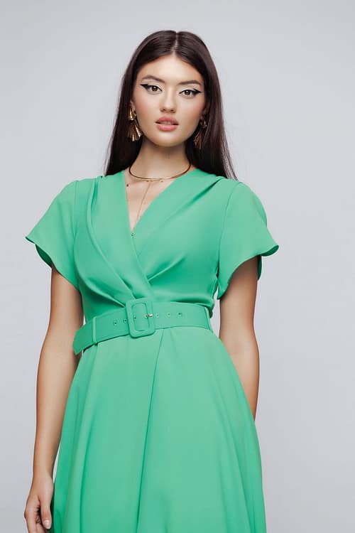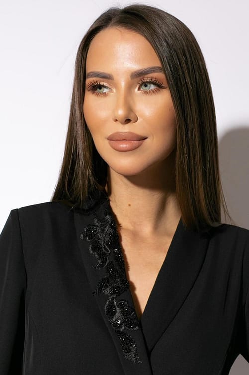Modelul poartă măsură 40, dimensiuni model: 1,74 cm înălțime, 88 cm bust, 63 cm talie, 94 cm sold